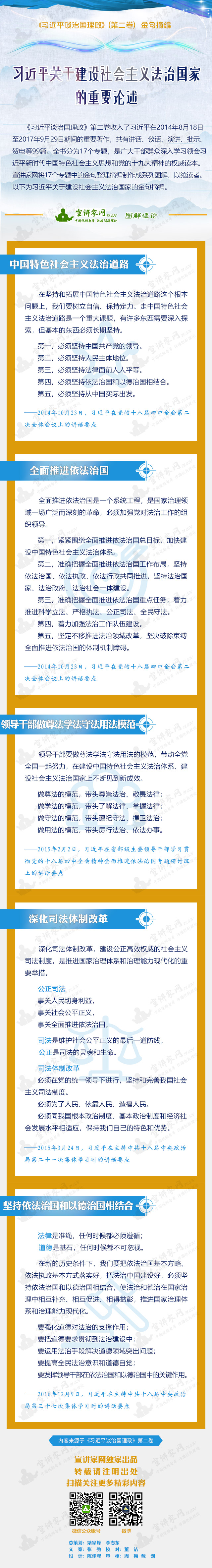 摘要:《習近平談治國理政》第二卷收入了習近平在2014年8月18日至2017年9月29日期間的重要著作,共有講話、談話、演講、批示、賀電等99篇。全書分為17個專題,是廣大干部群眾深入學習領會習近平新時代中國特色社會主義思想和黨的十九大精神的權威讀本。宣講家網將17個專題中的金句整理摘編制作成系列圖解,以饗讀者,以下為習近平關于建設社會主義法治國家的金句圖解。