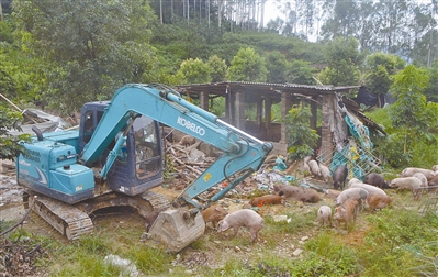 ② ?8月4日,由度尾鎮主要領導帶隊,全鎮干部職工組成聯合執法隊伍,對轄區內造成污染的畜禽養殖場進行強制拆除,拉開了該鎮新一輪污染防治攻堅戰的高潮。 ?為打好污染防治攻堅戰,度尾鎮鐵腕治污,組織所有鎮村干部,同時借助視頻監控、無人機等科技手段,對轄區內反彈復建、遷移至偏僻角落的養殖場進行地毯式大排查。當天,由度尾鎮黨委書記官金華、鎮長蔡俊賓分別帶隊,兵分兩路開展聲勢浩大的畜禽養殖整治統一行動,劍指前期排查出的12家畜禽養殖場。 ?沿著崎嶇的山路,記者跟隨執法人員來到度尾鎮湘溪村,一處大規模養豬場就藏身在深山山坳中?!霸擆B殖戶原本在潭邊社區養豬,被取締后就移入深山、躲避檢查?!眻谭ㄈ藛T表示,通過無人機航拍,這個大規模養豬場才被發現。 ?記者現場看到,該養豬場占地面積近2000平方米,6個簡易搭蓋的豬圈一字排開,圈養生豬500余頭。該養豬場位于湘溪村的小溪上游,豬糞污水直排小溪流經村莊,造成了嚴重污染。執法人員當場對該養豬場進行斷水斷電,并出動挖掘機拆除全部養豬設施。 ?在勵山村,2000多只鴨子被放養在秦宅溪上游,露天鴨場堆積著厚厚的鴨糞,臭氣沖天,現場還挖了三個蓄水池養鴨,造成污水橫流?!斑@個養殖戶郭某屢教不改,一年多以來,我們先后五次對他養殖場進行執法拆除。每次執法人員一走,他就私拉電線,重新搭起鴨舍,玩起了游擊戰?!眻谭ㄈ藛T表示。 ?為了徹底消除這一處頑疾,執法人員在拆除鴨舍、斷水斷電的同時,現場挖開蓄水池,將水放干,并堵塞了進入該養殖場的山路。 ?據統計,在為期一天的整治行動中,度尾鎮共拆除非法畜禽養殖場12家,拆除面積8000余平方米,涉及霞溪、東峰、云居、礪山、中峰、湘溪6個村。 ?度尾鎮黨委書記官金華接受采訪時表示,該鎮已與轄區19個村居的主干簽訂了《畜禽養殖整治責任書》,要求對轄區內畜禽養殖場及時整治、上報,并結合當前村級組織換屆選舉,對整治不力的村支部書記予以降職、村主任候選人一票否決。同時,對巡查、整治不力的鎮包片領導、包村工作隊進行問責。 ?圖①:拆除養豬場。 ?圖②:現場執法。 |