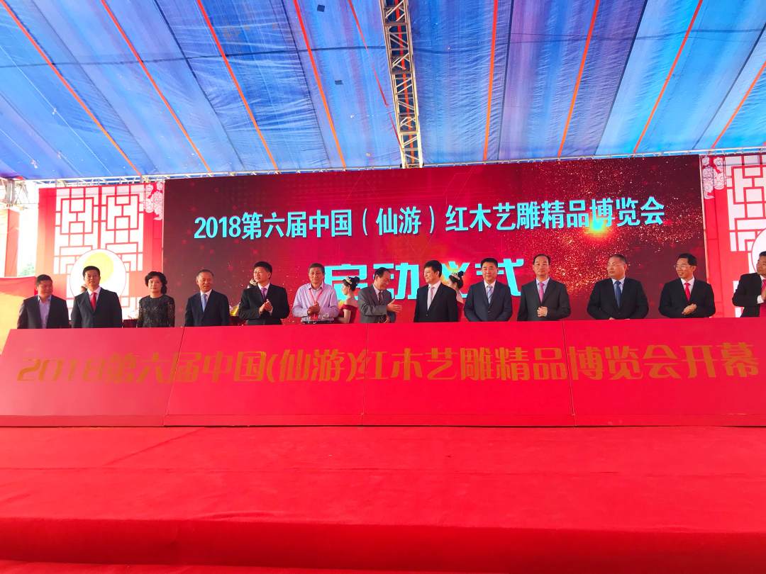 “2018年第六屆中國(仙游)紅木藝雕精品博覽會”啟幕現場 莆田市委副書記、市長李建輝,市人大常委會主任阮軍,市政協主席林慶生,市委常委、宣傳部長吳桂芳,副市長陳志強、陳惠黔等領導出席開幕式,并共同為“2018年第六屆中國(仙游)紅木藝雕精品博覽會”啟幕。