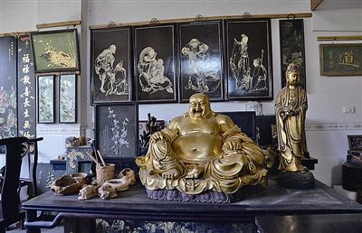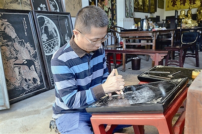 ③ 在賴店鎮土山村,有一戶人家,以祖輩相傳的漆刻手藝聞名鄉里,100多年來贏得了“漆芳世家”的美譽。今年43歲的傅宜鵬,就是這一珍貴民間技藝的第五代傳人。由他申報的“仙游傳統漆刻技藝”,入列莆田市第五批非物質文化遺產名錄。 記者走進傅宜鵬家中,空氣中散發生漆和木屑的芳香。其一樓、二樓的房間里,擺滿琳瑯滿目的漆刻精品。傅宜鵬巧手繪制下,這些工藝品披上了濃墨重彩的“外衣”, 仿佛賦予了新的內涵和生命,令第一次前來參觀的記者嘆為觀止。 在眾多的作品中,大廳中大型掛屏《天官賜福》最引人注目,這是傅宜鵬選取3米長、1.5米寬的杉木,運用了多種技法,耗時2個月才完成。這幅作品講述著一個古老的故事,飄渺的白云、巍峨的群山,如玉帶環繞的江面,仙人從天而降,樵夫行走山間,漁夫舟上垂釣,書生松下吟對……甚至是花鳥魚蟲,都栩栩如生。 傅宜鵬回憶說,12歲起,他就跟著父親外出學藝,16歲出師,至今已30余年了。父親傅金清因為手藝出眾,還被同行們冠上“漆清”的藝名,附近鄉鎮無人不知。在上世紀八十年代,做漆曾是一門風光的好手藝,工錢高,引得不少年輕人拜師學藝。如今,傳統的土漆制作工藝不再盛行,漆匠也大多放下漆刷另尋謀生之法。 傅宜鵬介紹,傳統漆刻技藝種類很多,包括刻漆、漆畫、堆漆、脫胎、漆藝仿古等,工序十分復雜。單單以刻漆為例,要在先制作好的漆柸上臨摹各種山水、人物、花鳥等所需要圖案,并運用各種刀具雕刻,接下來,并根據畫面要求進行填色、貼金、撒屑,工藝流程可歸納為刻、鏟、批、作、貼、撒等6步。 “除了要有嫻熟的手藝,還要有懂得鑒別、制作上好的土漆。”傅宜鵬說,土漆就是漆樹上割下來的漆漿,也稱為生漆。生漆制作也是一個復雜的過程,要經過分選、過濾、晾制、曬漆、細濾等幾道工序。之后,根據作品本身需要的色彩,加入不同的礦物顏料來調配。 如今,當地已經很少有人種漆樹了,傅宜鵬是從外地買回原料,然后自行制作。作品上漆也受天氣影響,一般溫度28-30℃、濕度75%的情況下,生漆能夠自然風干。溫度高了蒸發快,就需要加油、加水;溫度低了,又需要保暖。雖然化學漆使用方便、價格低廉,但傅宜鵬認為,傳統的土漆具有獨特的魅力,比如耐溫、耐腐、耐磨、耐熱、隔水和絕緣性好、富有光澤等特性,最大的優點莫過于它的環保性。“沒有添加化學用品,不會對人體產生危害”。 近年來,根據市場需求,傅宜鵬還在仿古漆藝和漆器修復方面下功夫。“要修復一件古代的漆藝作品,首先要讀懂它,了解他的年代、構造和成分。”傅宜鵬說,這樣才能夠達到“修舊如舊”的目的。“我是以古人為師,在漆器修復過程中不斷研究古人的技藝,在此基礎上創新提升自己的惡作品”。 雖然耗工費時,還得靠天氣,技術含量高,但傅宜鵬一直堅守這門手藝。他說:“祖傳的手藝,要好好傳承下去,不能在我的手里失傳了。”漆刻技藝入選市級非遺,也讓他看到了希望,給堅持了一輩子的老手藝找個好歸宿。 圖①:傅宜鵬在創作中。 圖②:堆漆作品。 圖③:脫胎漆藝佛像。 |