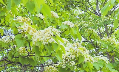 連日來,位于仙游縣城以北2公里的省級(jí)森林公園大蜚山上,油桐花盛開美如畫。驅(qū)車在莆永高速路上或到東渡山、客山公園登高望遠(yuǎn),只見綠油油的山巒點(diǎn)綴著一簇簇潔白的油桐花,仿佛群山飛雪,蔚為壯觀(如圖)。 大蜚山方圓1435公頃,森林覆蓋率高達(dá)92%。近年來,仙游縣斥資近億元對(duì)園內(nèi)森林資源進(jìn)行保護(hù)性開發(fā),開設(shè)生物防火林帶近20公里,新植楓樹、油桐、樟樹、桂樹等1萬多棵,增設(shè)10多公里游步道和十幾個(gè)亭榭,興建近5公里的大蜚山綠色通道,并常年派人巡山護(hù)林,使得大蜚山生機(jī)盎然。位于大蜚山半山腰、總長(zhǎng)7公里的蜚山綠道,宛如一條長(zhǎng)龍?jiān)谏介g穿梭,為市民提供親近自然、休閑健身的綠色長(zhǎng)廊,每天都吸引成千市民前往。 油桐樹是大蜚山上常見的喬木,集中成片生長(zhǎng)。由于今年平均氣溫較高,油桐樹花期提早來臨,野生或種植的油桐樹花團(tuán)錦簇,白花如雪,被譽(yù)為“五月雪”。目前,大蜚山景區(qū)遍布油桐樹上萬棵,花開正盛,潔白的花瓣或掛在樹上,或隨風(fēng)飄落,綿延成一片香雪海,別有一番詩(shī)情畫意。 筆者慕名進(jìn)園探訪,遠(yuǎn)遠(yuǎn)地就聞到淡淡的清香。穿過山間小路,即見到油桐樹,有一株一株的,有三五成群的,還有連成一片的,可謂移步換景。每一束油桐花都呈蜂窩狀,一束緊挨著一束,片片雪白,拼成了最美最壯觀的華蓋。 |