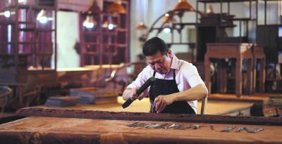 5日,記者來到位于仙游縣鯉城街道與榜頭鎮(zhèn)交界處的三福藝術(shù)館。大師工作室內(nèi),51歲的家具制作雕刻藝術(shù)大師黃福華正在一尊色澤暗沉的木樁上精雕細刻,刻刀在他手中上下翻飛,刀起刀落間,圖案慢慢呈現(xiàn),淡淡的木材特有的清香擴散開來。 每天帶著傷口回家 黃福華的祖父、父親都是出色的木雕師,他13歲開始學(xué)藝。 “那時候,有錢人家會請三五個師傅‘打擂臺’,誰的做工好、快,就留誰。有次看到父親參加‘打擂臺’,心里極其不安,萬一打輸,一家人生計就成問題了。在擔心的同時,我也暗下決心學(xué)好技藝,做最好的木工。”黃福華談到自己的學(xué)藝經(jīng)歷時說,這是一段辛酸但也磨礪意志的經(jīng)歷,更是他一生的財富,“出師后,我最得意的就是雕龍,活靈活現(xiàn),坊間一致稱贊”。 黃福華跟著父親到處去給人家做木工,開始了他的木雕生涯。“在別人讀書的時候,我就拿起了雕刻刀。那個時候,我父親辛苦一天的工錢1.8元,我?guī)椭蛳率郑环皱X沒有。但我立志要學(xué)藝,再苦再累,都要堅持。”黃福華說,“做木雕,基本功就要學(xué)上4年,有時候還不一定能學(xué)好。” 黃福華介紹,最初學(xué)木雕,單單是把20多種刻刀認清楚,就讓人有點吃力。“簡單說來,仙作的雕刻手法只有平地雕、透雕、圓雕、鏤雕、雙面透雕、錦地浮雕、透空浮雕等。但實際雕刻中,還會因器件大小、作品圖案繁簡等延伸出更多雕法。什么時候用什么刻刀,用什么手法才能雕出自然的線條,這些都是有要求和講究的。或許在多年的實踐中,每個雕刻師都有了自己的雕刻習慣,但初學(xué)者握刀、走刀一定要有規(guī)范,肯定不能按照自己生活中養(yǎng)成的習慣來操刀。” “說實話,學(xué)藝過程很痛苦,每天十四五個小時,除了仔細看父親的每一個動作,還要學(xué)習辨認各種木材以及它的年齡,要學(xué)習選木材、設(shè)計作品、鋸木頭、刨平、拼接,要掌握一個木工應(yīng)具備的所有技能。受傷更是家常便飯。”黃福華一邊把滿是傷痕的雙手展示給記者看,一邊說,“那些年我每天都會帶著傷口回家,舊傷沒好又添新傷,手上除了灰塵就是鮮血。這些年下來,手上沒有一條完整的手紋。” 如今,黃福華能將普通的木料變成一件件藝術(shù)作品。做了多年木雕匠人,對于這門傳統(tǒng)技藝,他早已是愛入骨髓。每天拿起工具在木料上細心雕琢,這就是黃福華最幸福、最高興的時刻。 刻錯一刀沒法修補 來到加工車間,陣陣拉鋸聲和敲擊聲傳出,這里沒有現(xiàn)代化機器設(shè)備的蹤影,只有一張張排列有序的手工操作臺和正在低頭干活的匠人,他們或挑或鑿,或琢或磨,對記者的到來全然不覺。 “工匠眼里只有手中的活,不閑聊或主動跟人寒暄,做事認真專注。”黃福華說,這手中的活可不一般,是一整套純手工制作的紅木家具。 黃福華走過一張張操作臺,不時接過工匠手上的刻刀操作一番,修補雕刻中的不足之處。“古典家具生產(chǎn)流程極為繁雜,需要群體智慧和勞作方能完成。每件完美的古典家具,都是集思廣益的結(jié)晶。”黃福華說,“每天穿行在車間,看著身邊形形色色的紅木制品,我總有一種面對歷史的感覺,讓人褪去都市生活的煩躁。” “作為一名合格的工匠,必須熟練地應(yīng)用仙游古典家具制作雕藝,要懂得巧妙融合平、透、鏤、微等雕刻技巧,在行刀運鑿時要洗練灑脫,刀下的線條要清晰流暢。”黃福華說。 紅木家具的制作是精雕細琢的過程,凝聚著工匠的大量心血。時至今日,黃福華和他的團隊依然堅持秉承祖?zhèn)鞴诺涔に嚨囊I(lǐng),傳承明清家具的精髓,制作出來的古典家具造型簡練、結(jié)構(gòu)嚴謹、裝飾適度、紋理優(yōu)美。 “一件紅木家具的誕生,往往需要依次經(jīng)歷造型設(shè)計、選材開料、木工制作、雕刻裝飾、打磨拋光、上膠油漆等工序,每一道工序都不能有絲毫馬虎。”談到紅木家具,黃福華似乎總有說不完的話,“古典家具制作周期長,快要兩三個月,慢則數(shù)年。原木購入后首先根據(jù)所制家具的尺寸量體裁衣進行鋸板,要長短搭配、綜合利用,并且注意木材紋理,否則會造成嚴重浪費和材質(zhì)搭配不當。” 黃福華說,榫卯是中國古典家具的“靈魂”,凸出的榫頭與凹入的卯眼通過相互咬合,巧妙地將木構(gòu)件緊密結(jié)合起來,達到天衣無縫的境界。它還能通過不同的形態(tài)、構(gòu)造,衍生出千變?nèi)f化的組合方式,使紅木家具達到功能、結(jié)構(gòu)與外觀的完美統(tǒng)一。 紅木家具的全部工藝,雕刻工藝占了一半以上。因此對手工雕刻的要求非常嚴格,在雕刻車間,每一名雕刻工在雕刻時都要集中精力,一旦刻錯一刀,整張木板就沒法修補了。黃福華說,再具天賦的人,要合格出師,也要10年左右。 用一生成就手藝 要成為一個真正合格的木雕師,前后需要十幾年的磨煉。“在這里,大家只看到一件木雕作品,但是這件作品背后的付出沒幾個人知道。通常,一件雕品光原料打磨拋光就要好幾天,個中辛苦,無人能知。我們每一位木雕師都是用自己一生的精力和時間鍛造自己的技藝。我們不僅在學(xué)藝的時候每天抱著木頭研習,承受著日復(fù)一日的枯燥、平淡。就是事業(yè)有成了,每天最重要的事情仍是不停練習,一個程序都不放過,一刻都不放松。”黃福華說。 “作為一名手藝人,