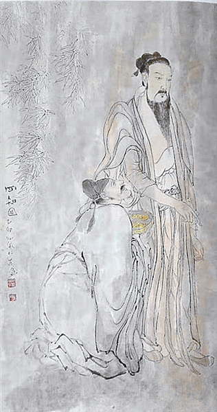 《四知圖》是孫仁英先生的工筆代表作之一,畫(huà)的是楊震“暮夜卻金”的故事(如圖)。傳說(shuō)東漢時(shí)弘農(nóng)華陰人楊震,赴任山東萊州太守,途經(jīng)昌邑,他從前舉薦的荊州秀才、現(xiàn)任昌邑縣令王密,前來(lái)拜見(jiàn),到了夜里,王密懷揣十斤黃金來(lái)送給楊震。楊震說(shuō):“我了解你,你不了解我,為什么呢?”王密說(shuō):“夜里沒(méi)有人知道。”楊震說(shuō):“上天知道,神明知道,我知道,你知道,怎么說(shuō)沒(méi)有人知道呢?”王密聽(tīng)了羞愧地拿著黃金出去了。于是,楊震因“四知”之言而聞名天下,古今中外,影響很大。后人便將楊震稱(chēng)為“四知先生”,贊美他為官清廉,潔身自好。 楊震“暗室不欺心”的言行,自古以來(lái),一直在潛移默化中喚醒了不少人們的心靈美,也教育了不少人,尤其是官吏。就在當(dāng)今也可堪稱(chēng)是一張警示圖。所以,孫仁英先生特意選擇創(chuàng)作《四知圖》來(lái)謳歌正氣,批判卑污。為了突顯楊震正氣凜然的形象,孫先生又以趨于寫(xiě)實(shí)的工整、細(xì)膩、嚴(yán)謹(jǐn)?shù)墓すP技法來(lái)繪畫(huà)《四知圖》,使人物更加逼真細(xì)膩,精致典雅,古樸優(yōu)美,加上環(huán)境的煊染烘托,人物的神志氣質(zhì)躍然紙上,不由得把觀者引入畫(huà)中的境界,思緒繚繞,感慨萬(wàn)千。 所謂工筆畫(huà),就是以線造型,畫(huà)家的情感通過(guò)線條得以表現(xiàn),通過(guò)線條傳情達(dá)意,表現(xiàn)人物形象。線是中國(guó)工筆畫(huà)最基本的表現(xiàn)語(yǔ)言,是由畫(huà)家主觀提煉出來(lái)的。縱觀《四知圖》中人物和修竹的勾線,從起筆、行筆、收筆到運(yùn)筆的反、正、轉(zhuǎn)、折,從線條的虛實(shí)、方向、力度、彈性、韻律到線條的質(zhì)感、量感、空間感、動(dòng)態(tài)感,可以看出孫先生的工筆畫(huà)基本功非常扎實(shí),其明快、流暢、曼妙、高雅、如絲如絮、剛?cè)嵯酀?jì)的線條所表現(xiàn)出的形式和技巧頗具獨(dú)特的審美價(jià)值。 《四知圖》設(shè)色以淡墨為主,局部淺絳淡彩,整體畫(huà)面典則俊雅、清異秀出,氣韻十分生動(dòng),具有濃郁的審美意趣。畫(huà)中楊震挺身側(cè)面,表情嚴(yán)肅,無(wú)視眼下手捧黃金,大有“稟自然之正氣,體高雅之弘量。”從美學(xué)角度來(lái)看,《四知圖》是孫仁英先生按自己的見(jiàn)識(shí)、才智和理想所虛擬出來(lái)的事物情景和藝術(shù)境界,這樣的事物情景是現(xiàn)實(shí)生活中難得一見(jiàn)的,是畫(huà)家“心造”之境。頗具中國(guó)畫(huà)獨(dú)特的“因心而造境”的藝術(shù)特征,不僅達(dá)到了“有氣韻則有生動(dòng)”的意境,且“無(wú)畫(huà)處也皆成妙境。”如畫(huà)中除人物與翠竹外,通過(guò)大面積的淡墨輕染來(lái)襯托畫(huà)面主體,使主體更為突出,那些輕染的淡墨,給觀賞者以豐富的想象余地,讓觀賞者回味無(wú)窮,畫(huà)中雖未畫(huà)出,但觀賞者可以放飛自己的想象,任思緒隨意馳騁,想象出許多意境。 同時(shí),畫(huà)面的左上角以翠竹作點(diǎn)綴,竹子乃象征人品清逸、氣節(jié)高尚和剛直不阿,恰好與楊震的高風(fēng)亮節(jié),互為映襯,人物畫(huà)意,交相輝映,情景相生,得意于畫(huà)外。 |