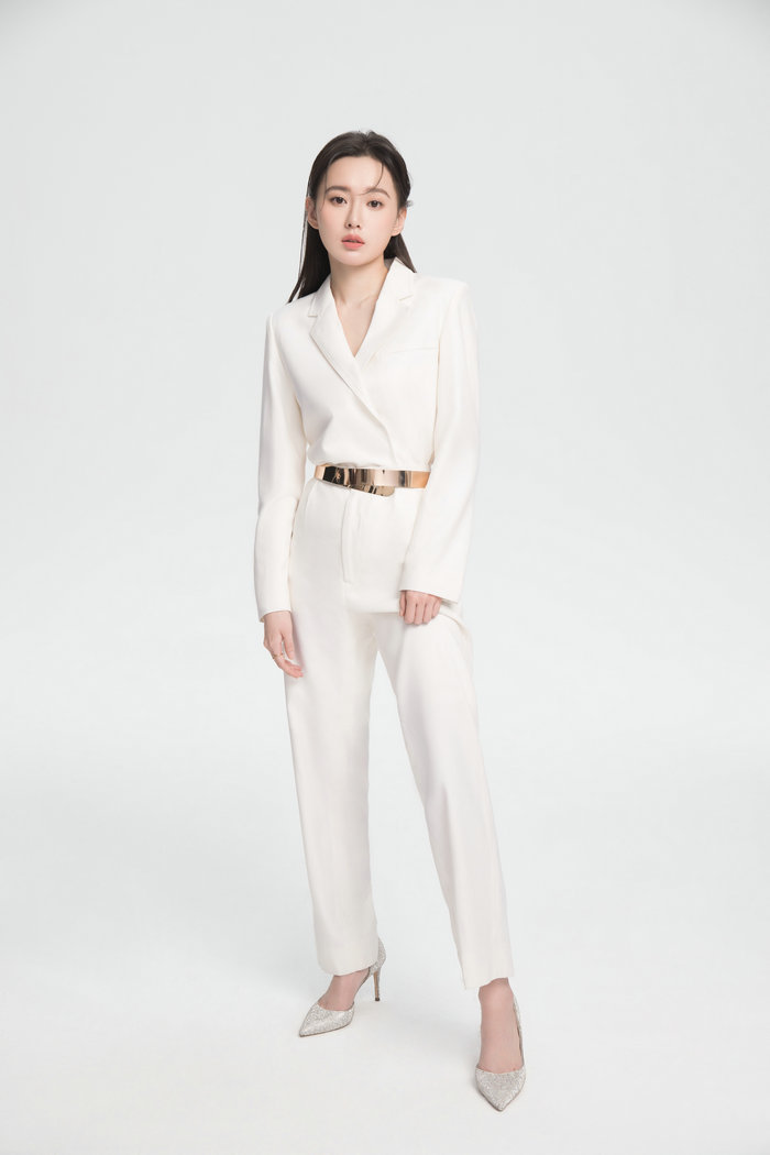 江鎧同一組純白西裝大片曝光。衣服設計簡潔大氣,唯一的裝飾物是腰間金色的腰帶,在配色上很高級,勾勒出纖細腰身同時也提高了腰線,并且起到了點“亮”全身的作用。