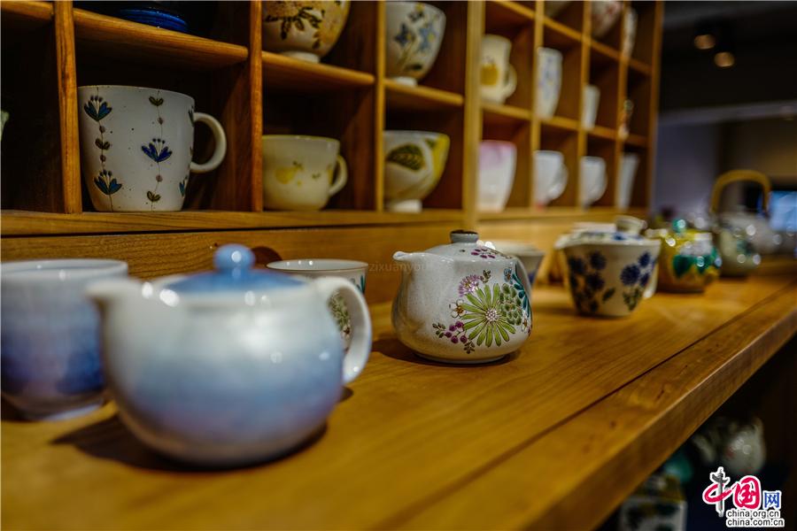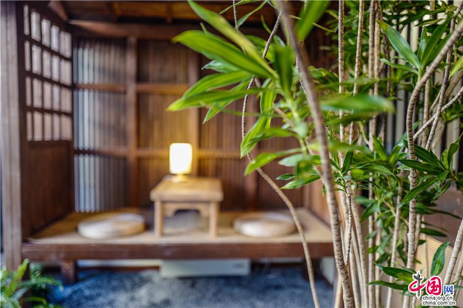 一家頗具日式風格的三層小店吸引了我,玻璃窗上寫著“那些隱藏的美好,等你來發現”,出于好奇走進店內,店主是從日本回來的文藝青年,因對園林設計的喜愛,便在這里做了個店面展示,并兼售一些日本陶器和工藝品,提供甜點茗茶,場地還可預約供雅集茶會。店內精心布置的綠植、亭閣,和露臺上的潺潺流水,營造出日式和風的清雅禪意,特別適合與友小坐品茗。
