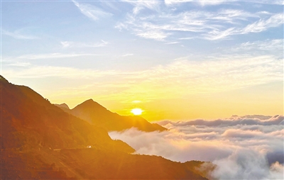 在紅日的映照下,云霧繚繞在群山之間,若隱若現(xiàn),如一幅山水畫卷,蔚為壯觀。“再美的風(fēng)景,不及和你看一場最浪漫的云海、晨光和落日余暉”。