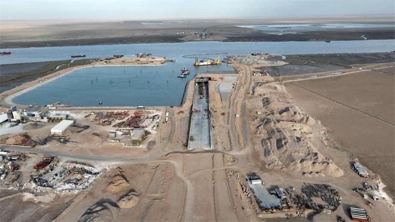 伊拉克最南端的波斯灣之畔。祖拜爾河邊,一條陸地隧道已建規模;河中央,大型非自航絞吸船正在進行疏浚作業;另一端的海塘內,水面漂浮著一排排黃色浮標,快艇穿梭在紅白相間的鋼筋塔間。