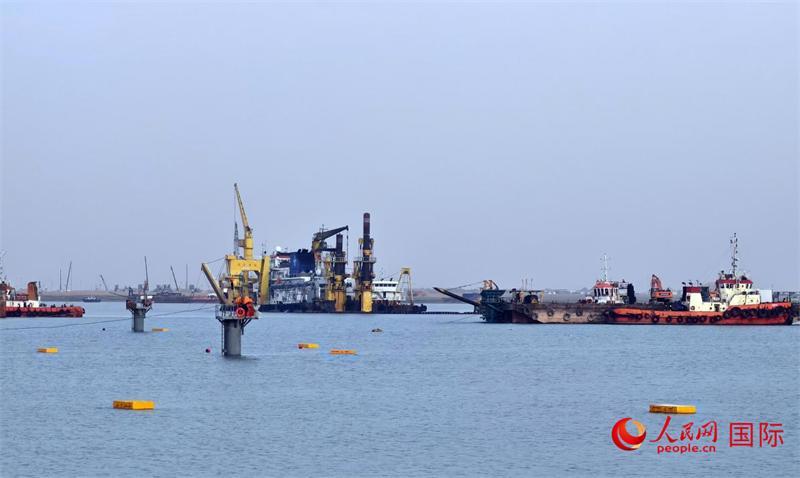 祖拜爾海底隧道施工場景。人民網記者 管克江攝 “浮標下暗藏崢嶸。每一個浮標代表一節長126m、寬35.6m、平均高11m、重約4萬噸的沉管?!敝薪惶旖蚝降谰钟邢薰痉▕W港項目經理武琳介紹,“河道疏浚完畢后,將由特定船只和設備把這些管道拉到指定位置埋入水下并貫通起來。最終形成約2.5公里長、六車道的海底隧道,這也將是中東地區第一條海底隧道。” 祖拜爾海底隧道是伊拉克法奧港項目的一部分。祖拜爾海底隧道所在的“烏—法”連接路主要用于連通法奧港和原先的舊港烏姆蓋薩爾港,并將港口與北方交通干線連接起來。項目由韓國大宇公司EPC總承包,中交天津航道局有限公司承擔基槽疏浚開挖、樁基、預制梁、部分沉管制造等工程。