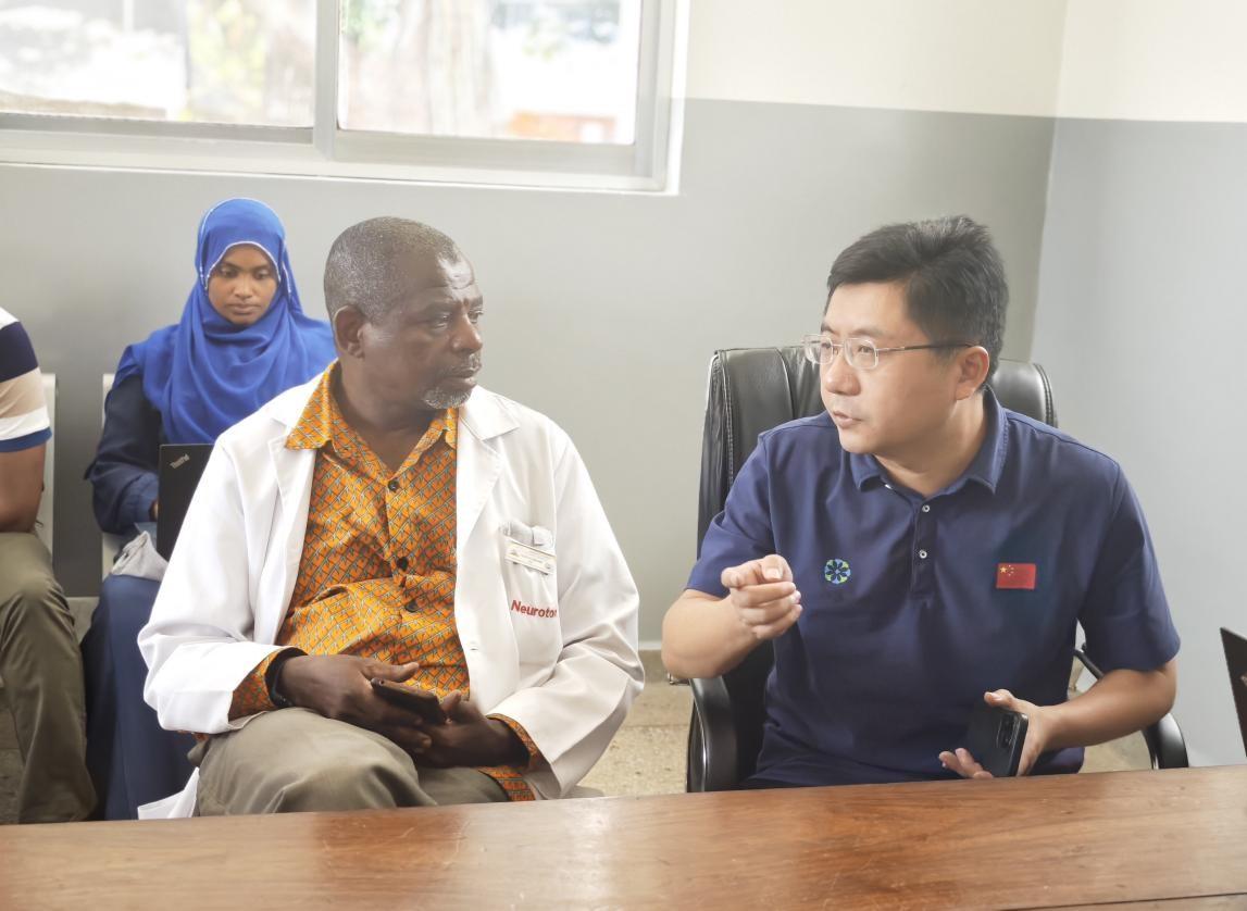 隊長陳煒與當地醫院負責人交流。中國援桑醫療隊供圖