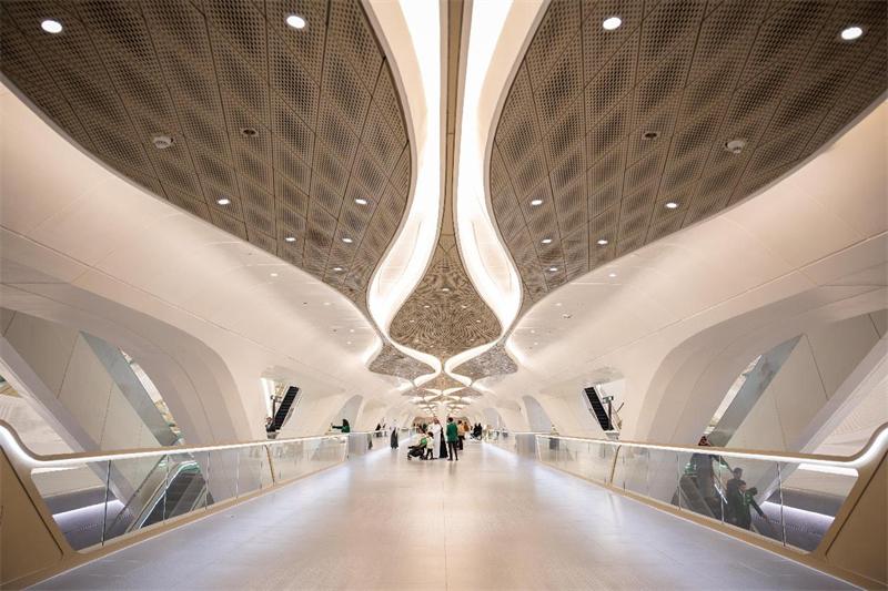 下班高峰期,利雅得阿卜杜拉國王金融區(qū)地鐵站內(nèi),兩側(cè)四個樓層的換乘扶梯載著人流上下行,繁忙而井然有序。這是利雅得地鐵的四個樞紐站之一,客流量很大。