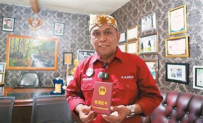 在印度尼西亞爪哇島東部的布爾沃索諾村,村長亨德里克展示“村長班”培訓證書。